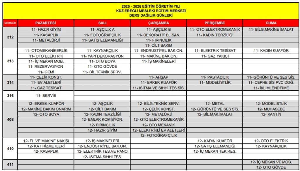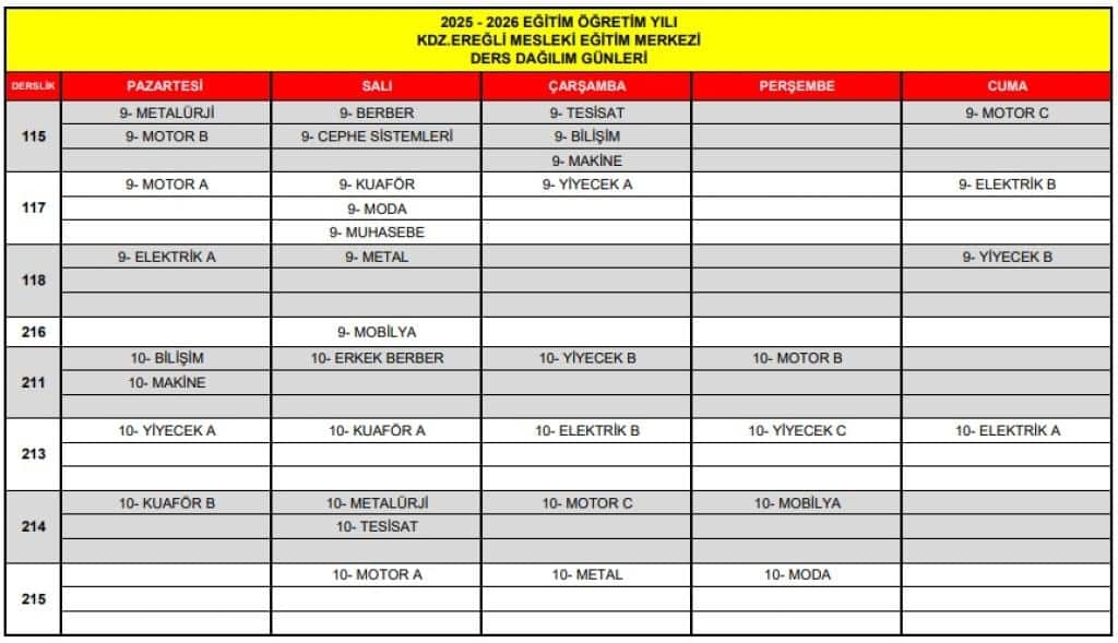 2025-2026 EĞİTİM ÖĞRETİM SINIF VE GÜN DAĞILIM ÇİZELGESİ